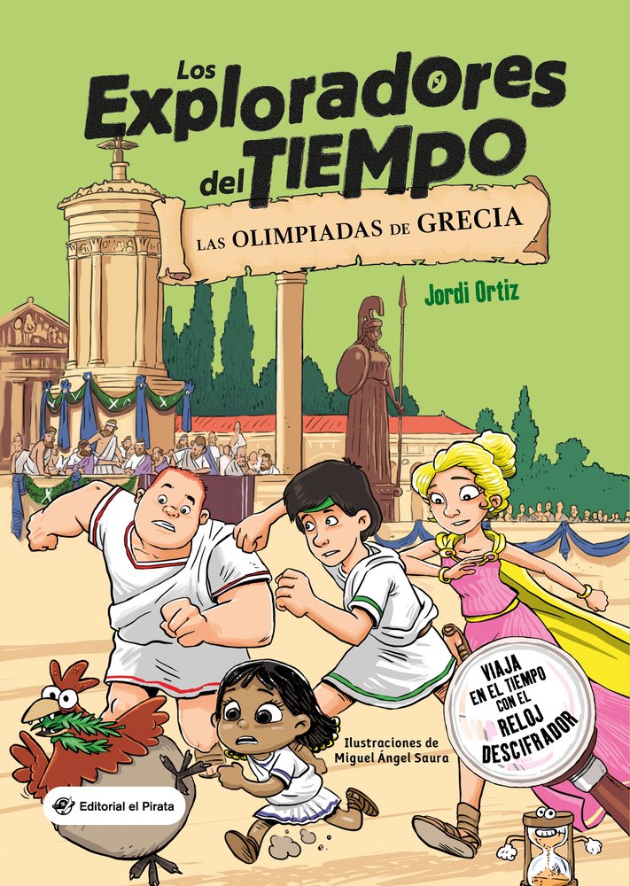 ¿Qué harías si te dijeran que es posible viajar por el tiempo? Las olimpiadas de Grecia es el tercer libro en español de la colección Los Exploradores del Tiempo, ilustrada a todo color y que combina diálogos de cómic con novela de aventuras para niños de entre 9 y 12 años. Cada libro nos permite disfrutar de un fascinante viaje por el tiempo de Víctor, Cristina, Celoni e Ibis, los protagonistas. Los lectores encontrarán algunas preguntas que permiten descubrir curiosidades históricas sobre antiguas civilizaciones. Para hacerlo, tendrán que usar el Reloj del Tiempo, incluido en el libro, para descifrar el número de página que se oculta tras un fondo de color rojo y así poder viajar por el tiempo para descubrir curiosidades históricas increíbles. En Las olimpiadas de Grecia, los Exploradores del Tiempo visitarán la Olimpia del año 556 a. C. durante la celebración de los Juegos Olímpicos. Para esta misión, tendrán que tratar de hacerse con la corona de oro de Heracles, aunque nadie sabe si dicho objeto existió de verdad o no es más que una leyenda. ¿Serán capaces de completar su misión antes de que Maléfico Durador les pare los pies?